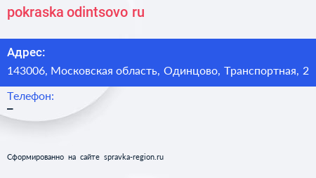 pokraska-odintsovo.ru по адресу 143006, Московская область, Одинцово, Транспортная, 2 в дальнейшем Организация, размещена в следующих категориях:
