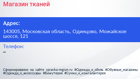 Магазин тканей по адресу 143005, Московская область, Одинцово, Можайское шоссе, 121 в дальнейшем Организация, размещена в следующих категориях: