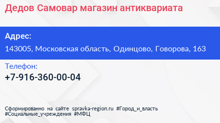 Дедов Самовар, магазин антиквариата по адресу 143005, Московская область, Одинцово, Говорова, 163 в дальнейшем Организация, размещена в следующих категориях: