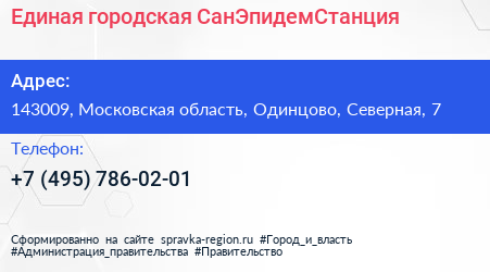 Единая городская СанЭпидемСтанция по адресу 143009, Московская область, Одинцово, Северная, 7 в дальнейшем Организация, размещена в следующих категориях: