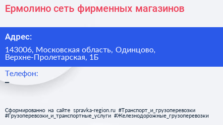 Ермолино, сеть фирменных магазинов по адресу 143006, Московская область, Одинцово, Верхне-Пролетарская, 1Б в дальнейшем Организация, размещена в следующих категориях: