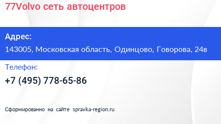 77Volvo, сеть автоцентров по адресу 143005, Московская область, Одинцово, Говорова, 24в в дальнейшем Организация, размещена в следующих категориях: