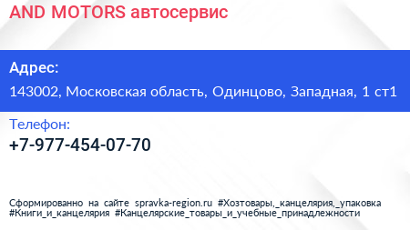 AND MOTORS, автосервис по адресу 143002, Московская область, Одинцово, Западная, 1 ст1 в дальнейшем Организация, размещена в следующих категориях: