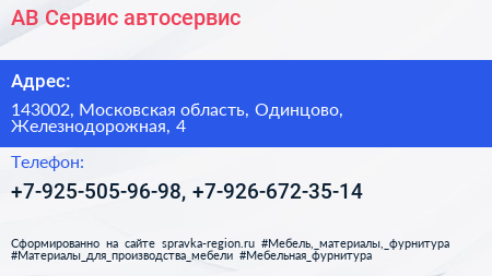 АВ Сервис, автосервис по адресу 143002, Московская область, Одинцово, Железнодорожная, 4 в дальнейшем Организация, размещена в следующих категориях: