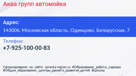 Аква групп, автомойка по адресу 143006, Московская область, Одинцово, Белорусская, 7 в дальнейшем Организация, размещена в следующих категориях: