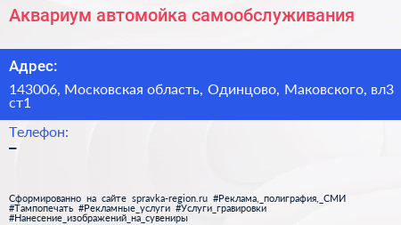 Аквариум, автомойка самообслуживания по адресу 143006, Московская область, Одинцово, Маковского, вл3 ст1 в дальнейшем Организация, размещена в следующих категориях: