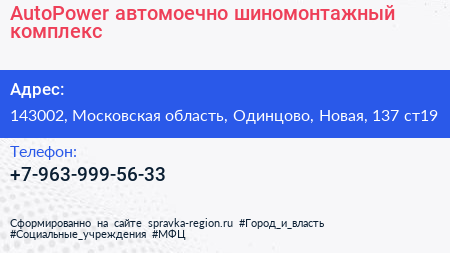 AutoPower, автомоечно-шиномонтажный комплекс по адресу 143002, Московская область, Одинцово, Новая, 137 ст19 в дальнейшем Организация, размещена в следующих категориях: