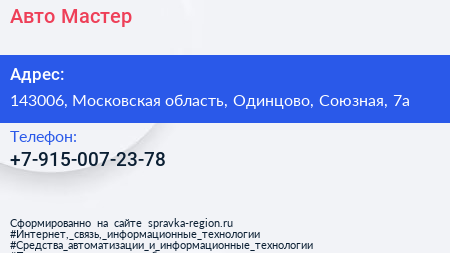 Авто-Мастер по адресу 143006, Московская область, Одинцово, Союзная, 7а в дальнейшем Организация, размещена в следующих категориях: