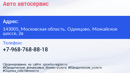 Авто, автосервис по адресу 143005, Московская область, Одинцово, Можайское шоссе, 2в в дальнейшем Организация, размещена в следующих категориях: