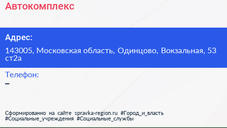 Автокомплекс по адресу 143005, Московская область, Одинцово, Вокзальная, 53 ст2а в дальнейшем Организация, размещена в следующих категориях: