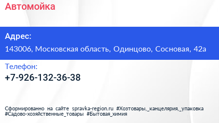 Автомойка по адресу 143006, Московская область, Одинцово, Сосновая, 42а в дальнейшем Организация, размещена в следующих категориях: