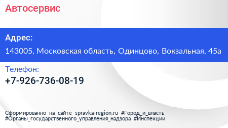 Автосервис по адресу 143005, Московская область, Одинцово, Вокзальная, 45а в дальнейшем Организация, размещена в следующих категориях: