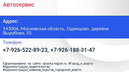 Автосервис по адресу 143006, Московская область, Одинцово, деревня Вырубово, 55 в дальнейшем Организация, размещена в следующих категориях: