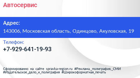 Автосервис по адресу 143006, Московская область, Одинцово, Акуловская, 19 в дальнейшем Организация, размещена в следующих категориях: