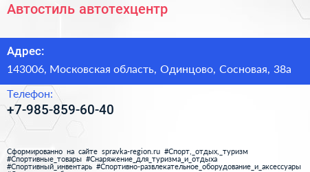 Автостиль, автотехцентр по адресу 143006, Московская область, Одинцово, Сосновая, 38а в дальнейшем Организация, размещена в следующих категориях: