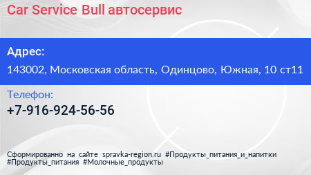 Car Service Bull, автосервис по адресу 143002, Московская область, Одинцово, Южная, 10 ст11 в дальнейшем Организация, размещена в следующих категориях: