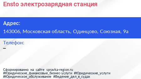 Ensto, электрозарядная станция по адресу 143006, Московская область, Одинцово, Союзная, 9а в дальнейшем Организация, размещена в следующих категориях: