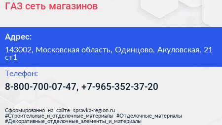 ГАЗ, сеть магазинов по адресу 143002, Московская область, Одинцово, Акуловская, 21 ст1 в дальнейшем Организация, размещена в следующих категориях: