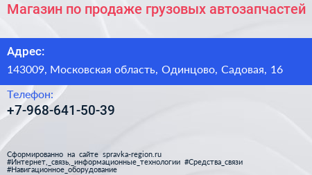 Магазин по продаже грузовых автозапчастей по адресу 143009, Московская область, Одинцово, Садовая, 16 в дальнейшем Организация, размещена в следующих категориях: