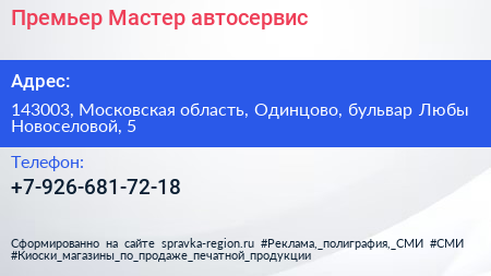 Премьер-Мастер, автосервис по адресу 143003, Московская область, Одинцово, бульвар Любы Новоселовой, 5 в дальнейшем Организация, размещена в следующих категориях: