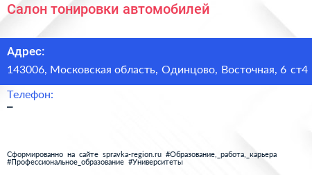 Салон тонировки автомобилей по адресу 143006, Московская область, Одинцово, Восточная, 6 ст4 в дальнейшем Организация, размещена в следующих категориях: