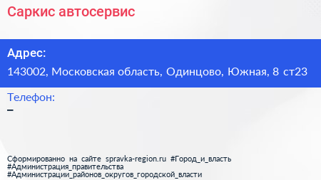 Саркис, автосервис по адресу 143002, Московская область, Одинцово, Южная, 8 ст23 в дальнейшем Организация, размещена в следующих категориях: