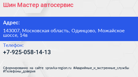Шин-Мастер, автосервис по адресу 143007, Московская область, Одинцово, Можайское шоссе, 14в в дальнейшем Организация, размещена в следующих категориях: