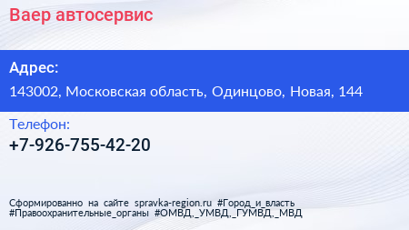 Ваер, автосервис по адресу 143002, Московская область, Одинцово, Новая, 144 в дальнейшем Организация, размещена в следующих категориях: