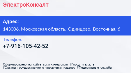 ЭлектроКонсалт по адресу 143006, Московская область, Одинцово, Восточная, 6 в дальнейшем Организация, размещена в следующих категориях: