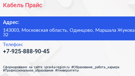 Кабель-Прайс по адресу 143003, Московская область, Одинцово, Маршала Жукова, 32 в дальнейшем Организация, размещена в следующих категориях:
