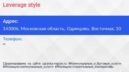Leverage-style по адресу 143006, Московская область, Одинцово, Восточная, 10 в дальнейшем Организация, размещена в следующих категориях:
