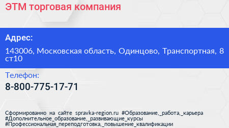 ЭТМ, торговая компания по адресу 143006, Московская область, Одинцово, Транспортная, 8 ст10 в дальнейшем Организация, размещена в следующих категориях: