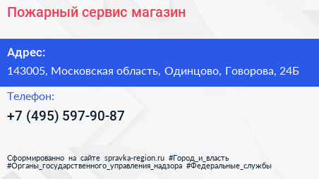 Пожарный сервис, магазин по адресу 143005, Московская область, Одинцово, Говорова, 24Б в дальнейшем Организация, размещена в следующих категориях: