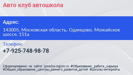 Авто-клуб, автошкола по адресу 143005, Московская область, Одинцово, Можайское шоссе, 151а в дальнейшем Организация, размещена в следующих категориях: