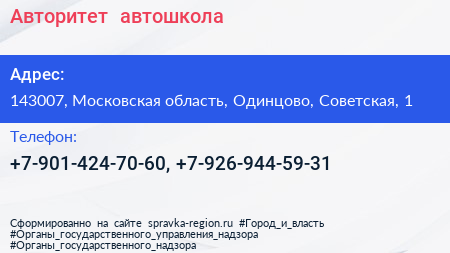 Авторитет+, автошкола по адресу 143007, Московская область, Одинцово, Советская, 1 в дальнейшем Организация, размещена в следующих категориях: