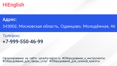 HiEnglish по адресу 143002, Московская область, Одинцово, Молодёжная, 46 в дальнейшем Организация, размещена в следующих категориях: