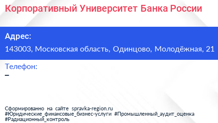 Корпоративный Университет Банка России по адресу 143003, Московская область, Одинцово, Молодёжная, 21 в дальнейшем Организация, размещена в следующих категориях: