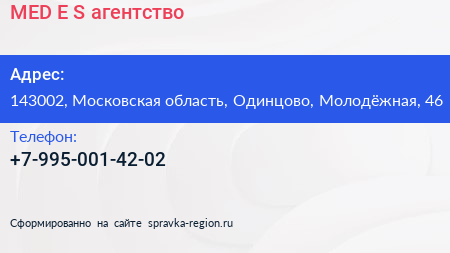 MED.E.S, агентство по адресу 143002, Московская область, Одинцово, Молодёжная, 46 в дальнейшем Организация, размещена в следующих категориях: