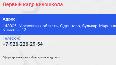 Первый кадр, киношкола по адресу 143005, Московская область, Одинцово, бульвар Маршала Крылова, 13 в дальнейшем Организация, размещена в следующих категориях: