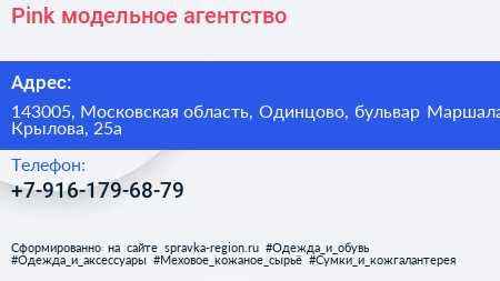 Pink, модельное агентство по адресу 143005, Московская область, Одинцово, бульвар Маршала Крылова, 25а в дальнейшем Организация, размещена в следующих категориях: