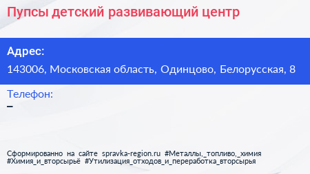 Пупсы, детский развивающий центр по адресу 143006, Московская область, Одинцово, Белорусская, 8 в дальнейшем Организация, размещена в следующих категориях: