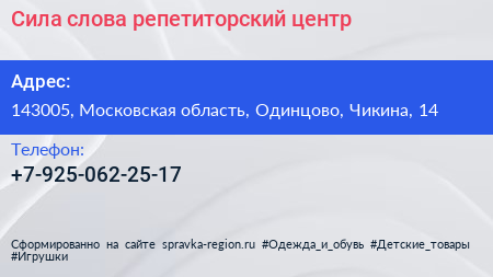Сила слова, репетиторский центр по адресу 143005, Московская область, Одинцово, Чикина, 14 в дальнейшем Организация, размещена в следующих категориях: