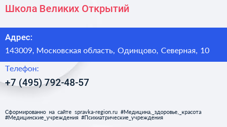 Школа Великих Открытий по адресу 143009, Московская область, Одинцово, Северная, 10 в дальнейшем Организация, размещена в следующих категориях: