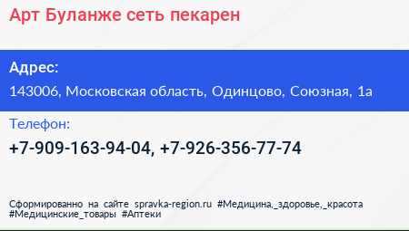 Арт Буланже, сеть пекарен по адресу 143006, Московская область, Одинцово, Союзная, 1а в дальнейшем Организация, размещена в следующих категориях: