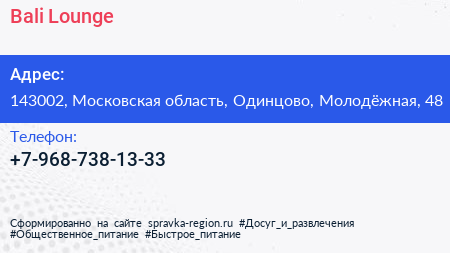 Bali Lounge по адресу 143002, Московская область, Одинцово, Молодёжная, 48 в дальнейшем Организация, размещена в следующих категориях: