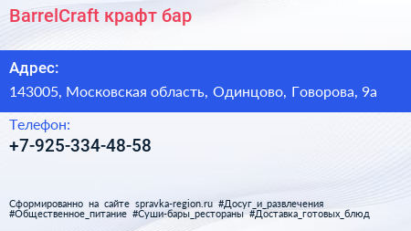 BarrelCraft, крафт-бар по адресу 143005, Московская область, Одинцово, Говорова, 9а в дальнейшем Организация, размещена в следующих категориях: