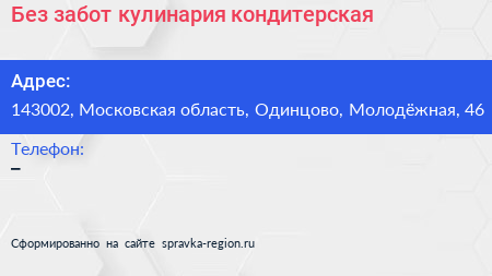 Без забот, кулинария-кондитерская по адресу 143002, Московская область, Одинцово, Молодёжная, 46 в дальнейшем Организация, размещена в следующих категориях: