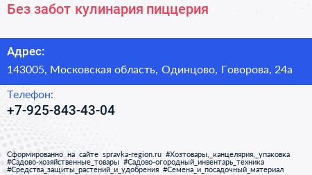 Без забот, кулинария-пиццерия по адресу 143005, Московская область, Одинцово, Говорова, 24а в дальнейшем Организация, размещена в следующих категориях: