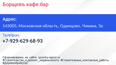 Борщевъ, кафе-бар по адресу 143005, Московская область, Одинцово, Чикина, 3а в дальнейшем Организация, размещена в следующих категориях: