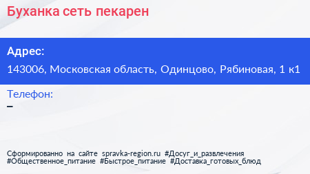 Буханка, сеть пекарен по адресу 143006, Московская область, Одинцово, Рябиновая, 1 к1 в дальнейшем Организация, размещена в следующих категориях: